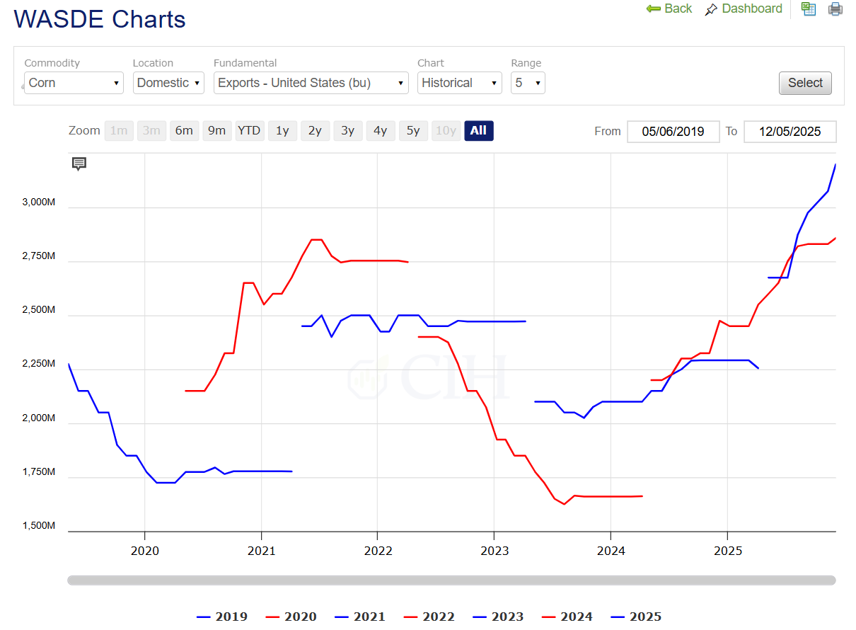 For corn, the domestic 2025/26 balance sheet called for higher exports and lower ending stocks. Exports were raised 125 million bushels to 3.2 billion bushels reflecting shipments to date. USDA noted export inspection data showed robust foreign demand during November, implying that total shipments during the Sep-Nov quarter (Q1 of marketing year) will likely exceed 800 million bushels and surpass the prior high set in 2007. With no other changes noted to the domestic balance sheet, ending stocks were forecast to decline a corresponding 125 million bushels to 2.029 billion and below the range of pre-report estimates (avg. 2.166, range: 2.037-2.376). On the World balance sheet, global corn production was lowered as a 3 million metric ton drop in Ukraine’s output more than offset a 1 million metric ton increase projected for the EU. USDA noted that corn production in Ukraine is sharply lower due to reductions in both area and yield based on government reported data to date, where harvest has been slow due to wet conditions in key growing areas. Global corn ending stocks were lowered to 279.2 million metric tons from 281.3 million in November. This was below analysts’ average pre-report estimate of 281.3 million metric tons and on the bottom end of the range of estimates (279.0-283.0 million range).