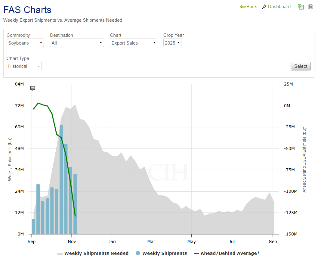 Despite a recent pickup in export commitments to China, soybean export sales remain well below the pace needed to reach the USDA forecast: