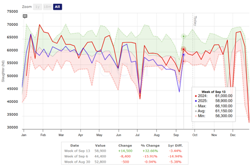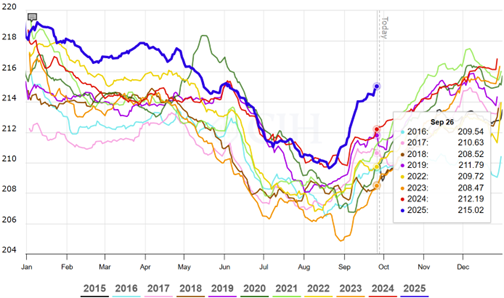 Pork production since early June was lower than implied from the June Hogs and Pigs report. Pork production under Federal inspection is down 2.1 percent year-to-date, although 2025 has had two fewer slaughter days in that calculation than last year. After tracking near year ago levels through most of the summer, producer sold hog weights are making their seasonal climb higher at a quicker pace than usual.