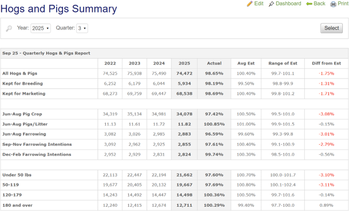 Four times a year, USDA’s Hogs and Pigs report offers a detailed snapshot of U.S. swine inventories and breeding intentions, providing critical insight for forecasting pork production and guiding market decisions. While subject to future revisions, it remains the most comprehensive assessment of current and expected animal supplies. The September 1 sow herd was estimated at 5.93 million head, down 2 percent from last year and below the low end of analysts’ pre-report expectations. Lighter-weight inventories also came in well under the average estimate, a development that could lend support to the market heading into Q1 2026.