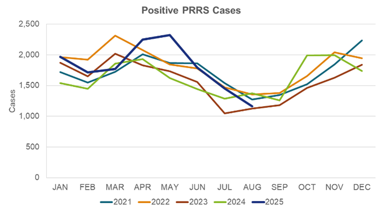 Data from the Swine Health Information Center’s Disease Reporting System suggests herd health is improving. Positive PRRS cases have seasonally fallen and, as of August, were near the lower end of the five-year range. Client feedback confirms this trend. We will continue monitoring this critical data and its impact on pig flow, and perhaps most importantly, how quickly the incidences pick up again as we head into the colder winter months.