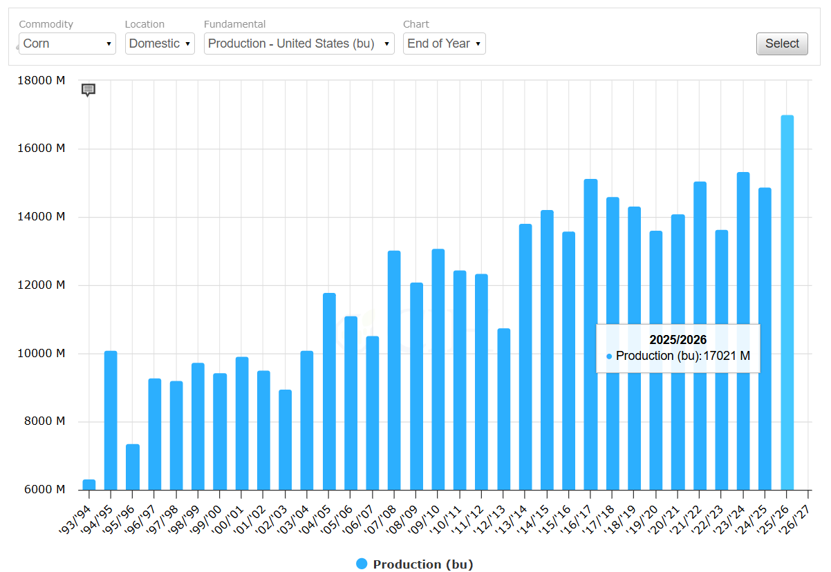 Corn production at 17.021 billion bushels would be a new record high, far exceeding the previous record crop in 2023: