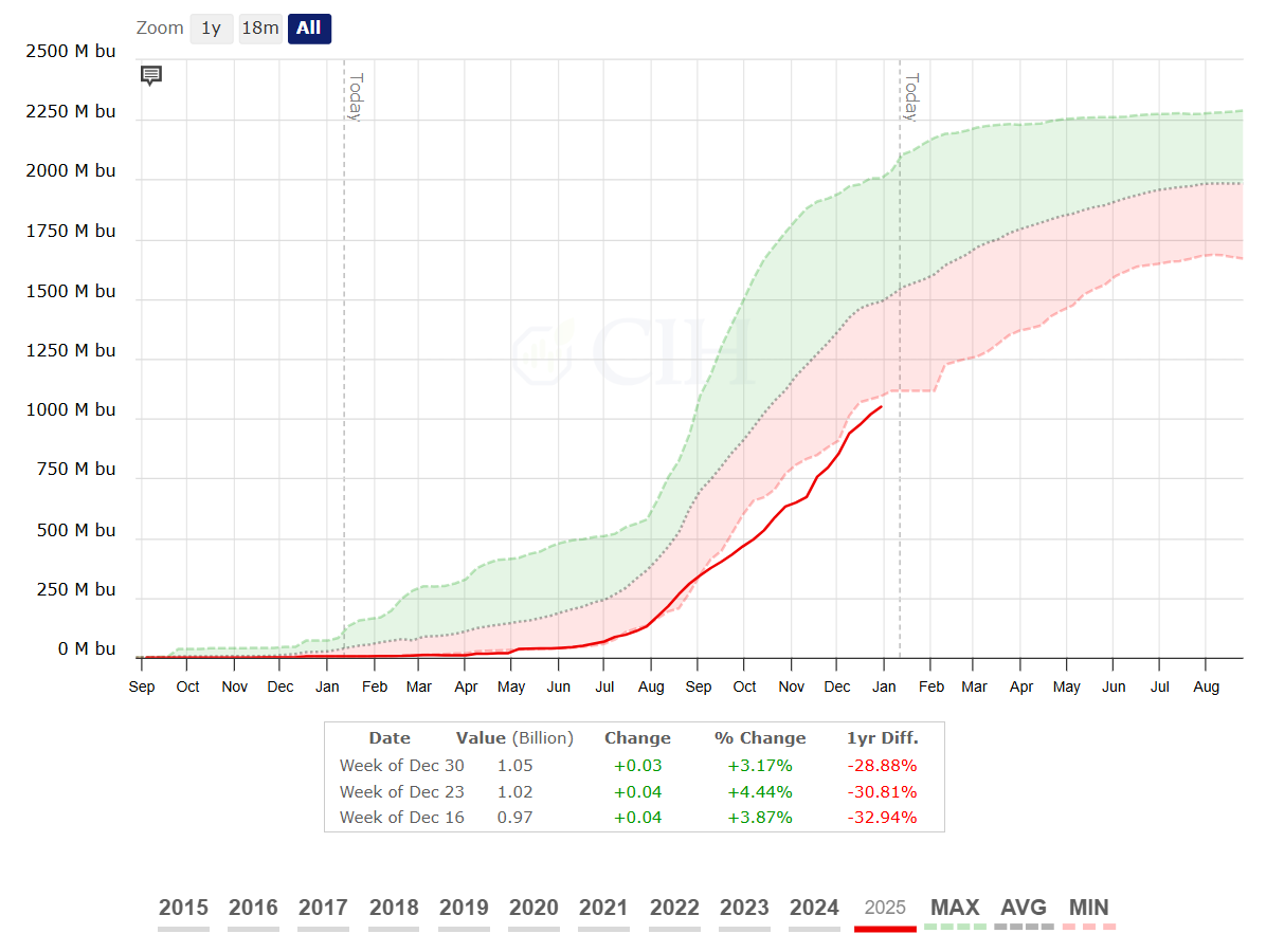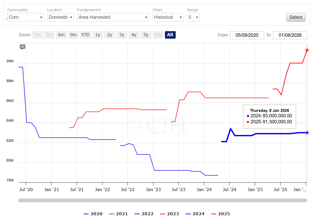 For corn, the domestic 2025/26 balance sheet called for higher production and stocks with increased demand only offsetting a portion of the larger supply. USDA raised both planted and harvested corn acres by 100,000 and 1.3 million, respectively, with yield also forecast up 0.5 bushels per acre from the previous forecast to 186.5 BPA. Total production was raised 269 million bushels from December to 17.021 billion, a new record high that well exceeds to previous record set in 2023 by 1.7 billion bushels. Total corn production, yield and harvested acres all came in above the range of pre-report estimates. Corn production at 17.021 billion bushels compares to the average trade guess of 16.544 billion (range: 16.353-16.724), yield at 186.5 bushels per acre compares to the average trade guess of 183.9 bushels (range: 182.0-185.3), and harvested acres at 91.3 million compares to the average trade estimate of 89.9 million (range: 89.3-90.4). Since the July WASDE, harvested area has surged 4.5 million acres. December 1 corn stocks were estimated at 13.282 billion bushels compared to the average trade guess of 13.040 billion (range: 12.275-13.369), with feed and residual use projected up 100 million bushels from last month to 6.2 billion based on indicated disappearance during the Sep-Nov quarter as reflected in the Grain Stocks report. Food, seed and industrial use is forecast down slightly by 10 million bushels from last month, reflecting reductions in the amount of corn used for glucose, dextrose and high fructose corn syrup. With supply increasing more than projected demand, ending stocks were forecast up 198 million bushels to 2.2 billion, with the average farm price raised $0.10 from December to $4.10/bushel.