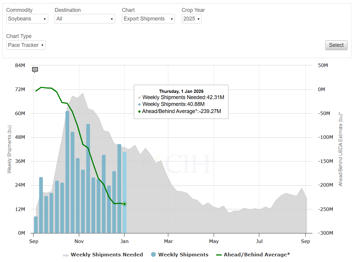Despite a recent pickup in export commitments to China, soybean export sales remain well below the pace needed to reach the USDA forecast: