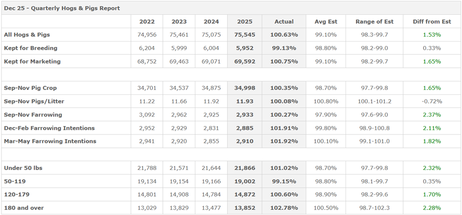 USDA released its quarterly Hogs and Pigs report on December 23, providing updated insight into inventories, farrowings, and farrowing intentions. Relative to pre-report expectations, the data leaned bearish. Total hog inventory on December 1 was estimated at 75.545 million head, up 0.63 percent from a year ago and modestly above the September estimate. Pigs kept for breeding were slightly below year ago levels, as expected. Pigs kept for marketing totaled 69.592 million head, 0.75 percent higher than last year and above the upper end of analysts’ pre-report ranges. The September–November pig crop was record large, supported by a record pigs per litter rate over the same period. Inventory levels in the under 50-pound, 120 to 179-pound, and 180 pounds and over categories all exceeded year-ago levels and came in above the high end of pre-report expectations.