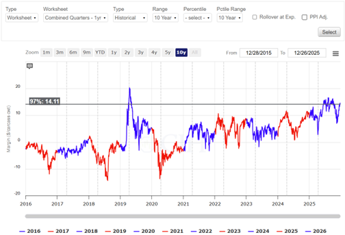 Feed costs remain favorable across much of the country, keeping costs of production in check. South American weather has been largely uneventful to date, with no material concerns at this stage of the growing season. The January 12 WASDE will deliver final crop production estimates for the 2025/26 domestic balance sheet and, absent a surprise, should confirm ample U.S. supplies. While a renewed flare-up in Black Sea tensions has captured recent headlines, grain futures have thus far priced in little in the way of sustained risk premium.