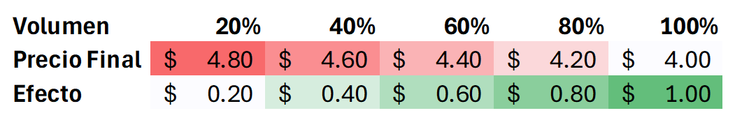 Efecto de coberturas según volúmenes protegidos ante subida del mercado de $4.00 a $5.00: